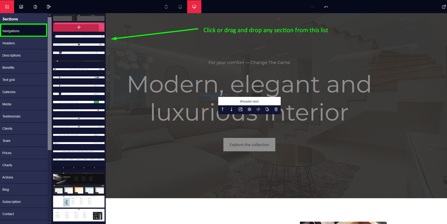 To add a section, click the section icon and then click the section category and then click or drag the section style which you choose. The steps age given in below picture.