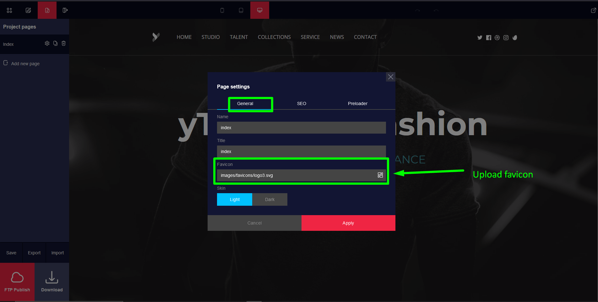 Click on the Porject Page icon and then its show the page list and then click setting icon of the page then a page setting modal will be show in the middle of the window, here we click general tab and then we can select Favicon image.