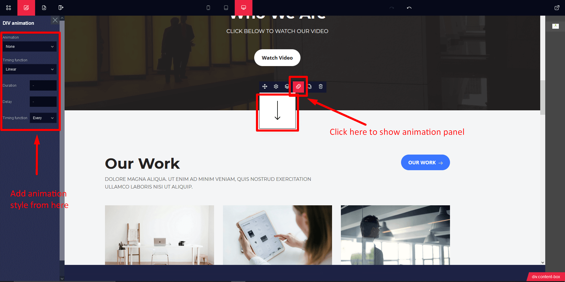 Click on the section of project page and then show a panel then click animation icon after that a side menu will be open on left of the window, here we can select and add animation style.