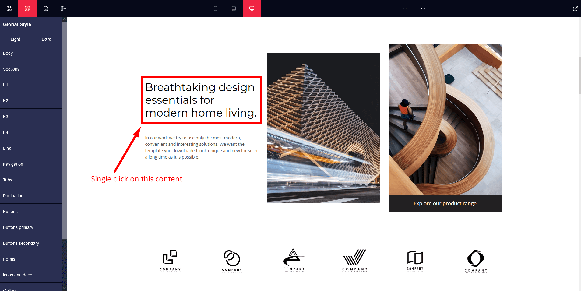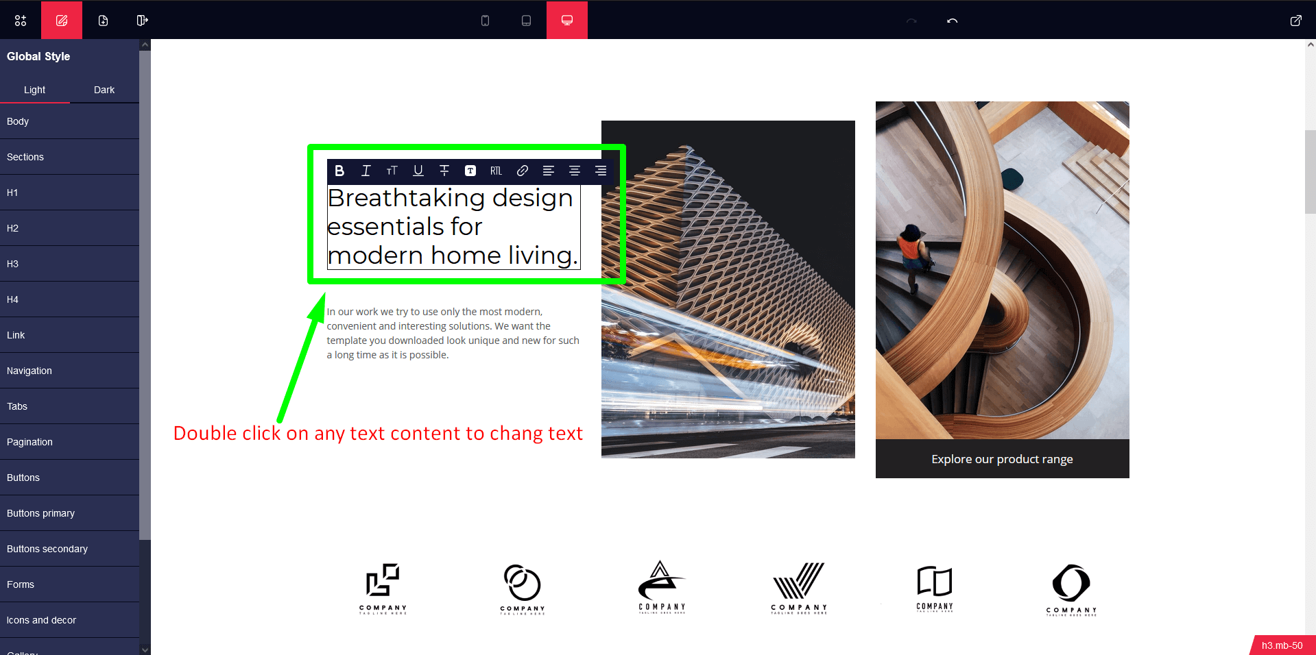 Change or update content of the section, Single click on the content and you can see a edit panel.