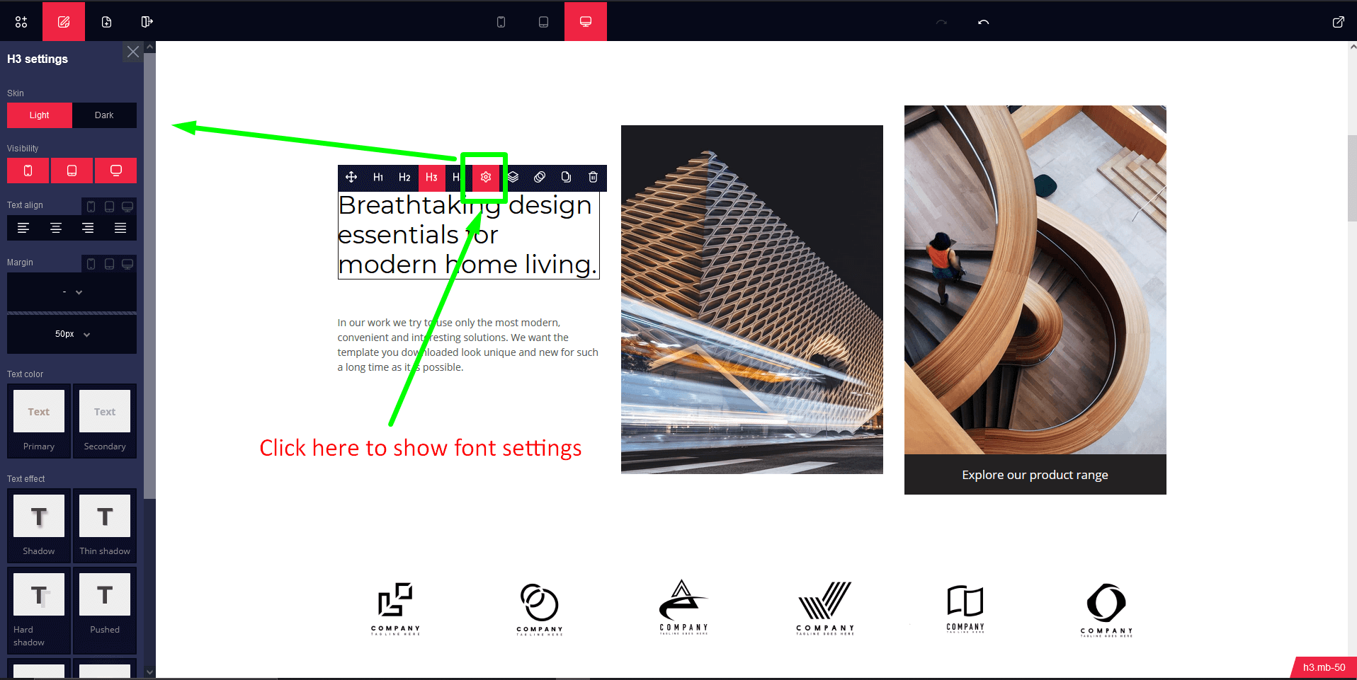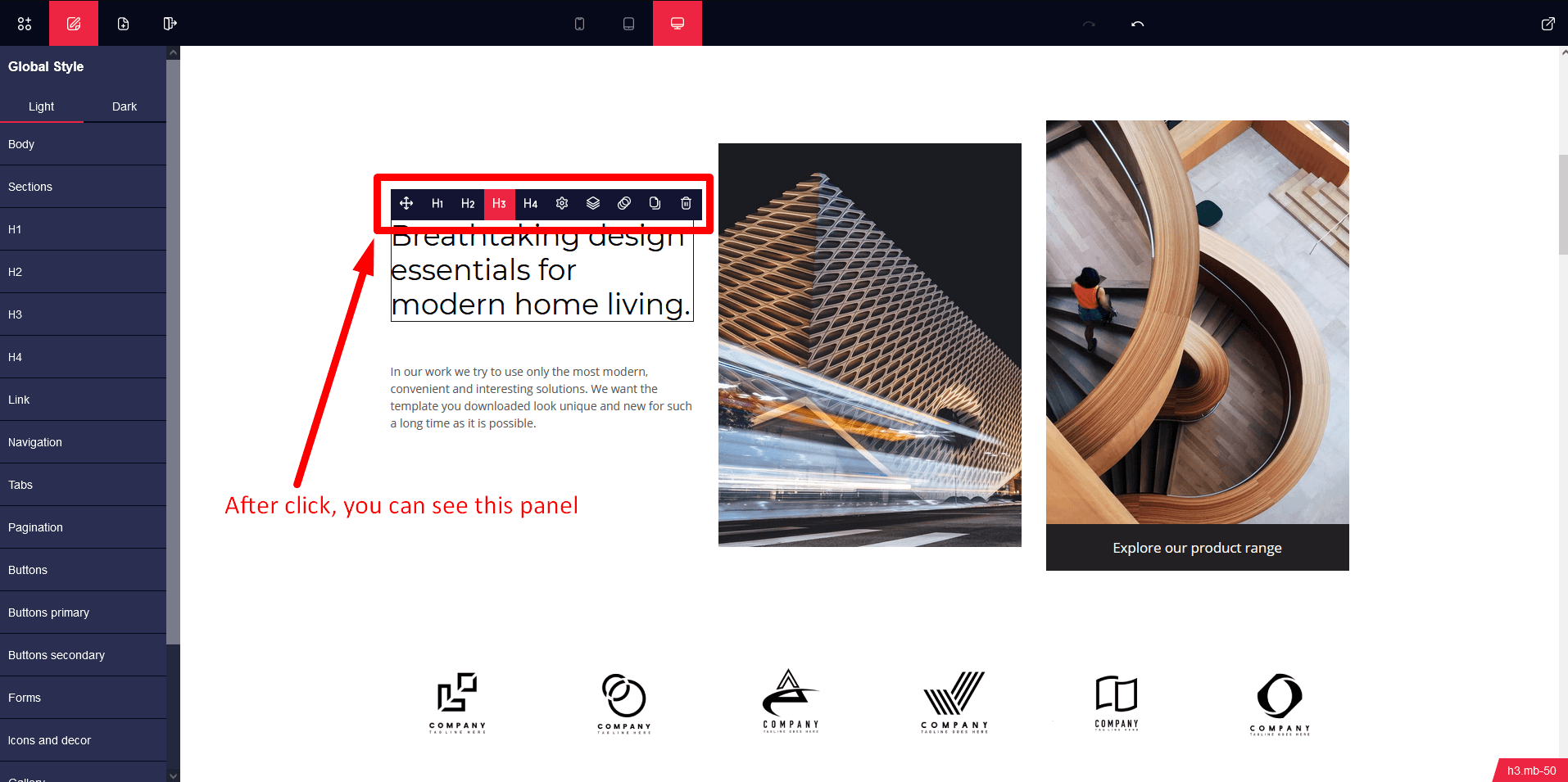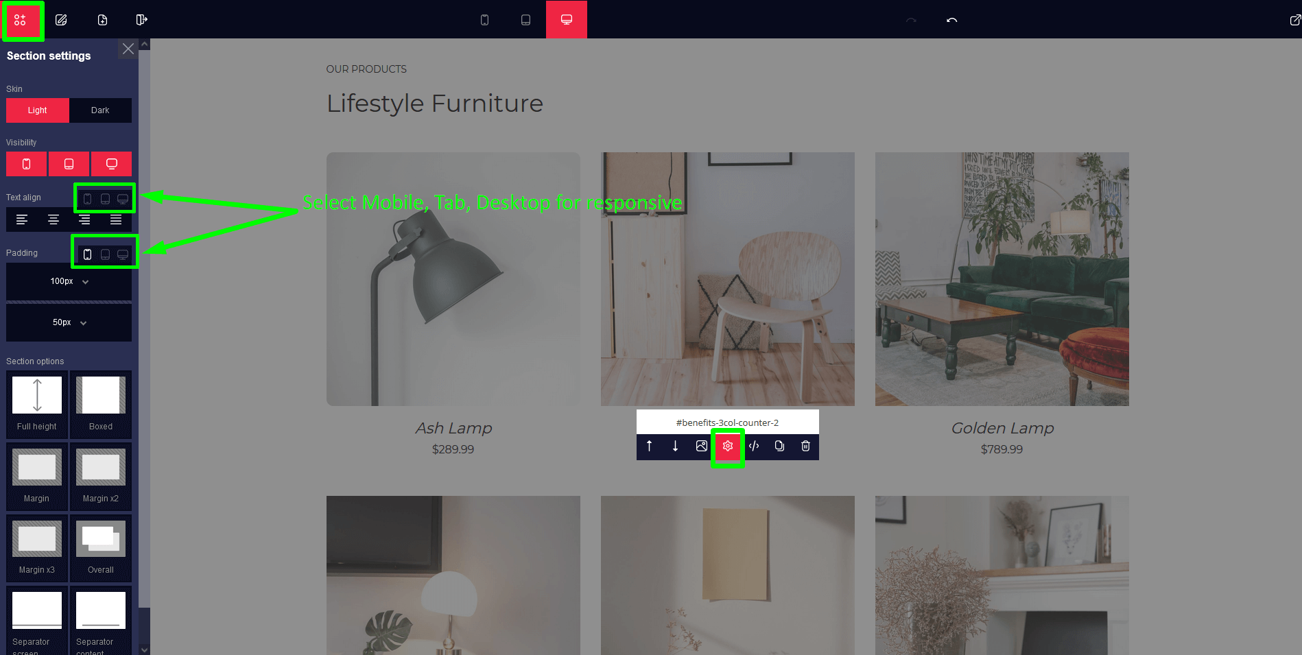 Click on the Section icon then every sections show a panel, here we click settings icon then a sidebar open on the left side, Select device and change Text align, Padding individually.