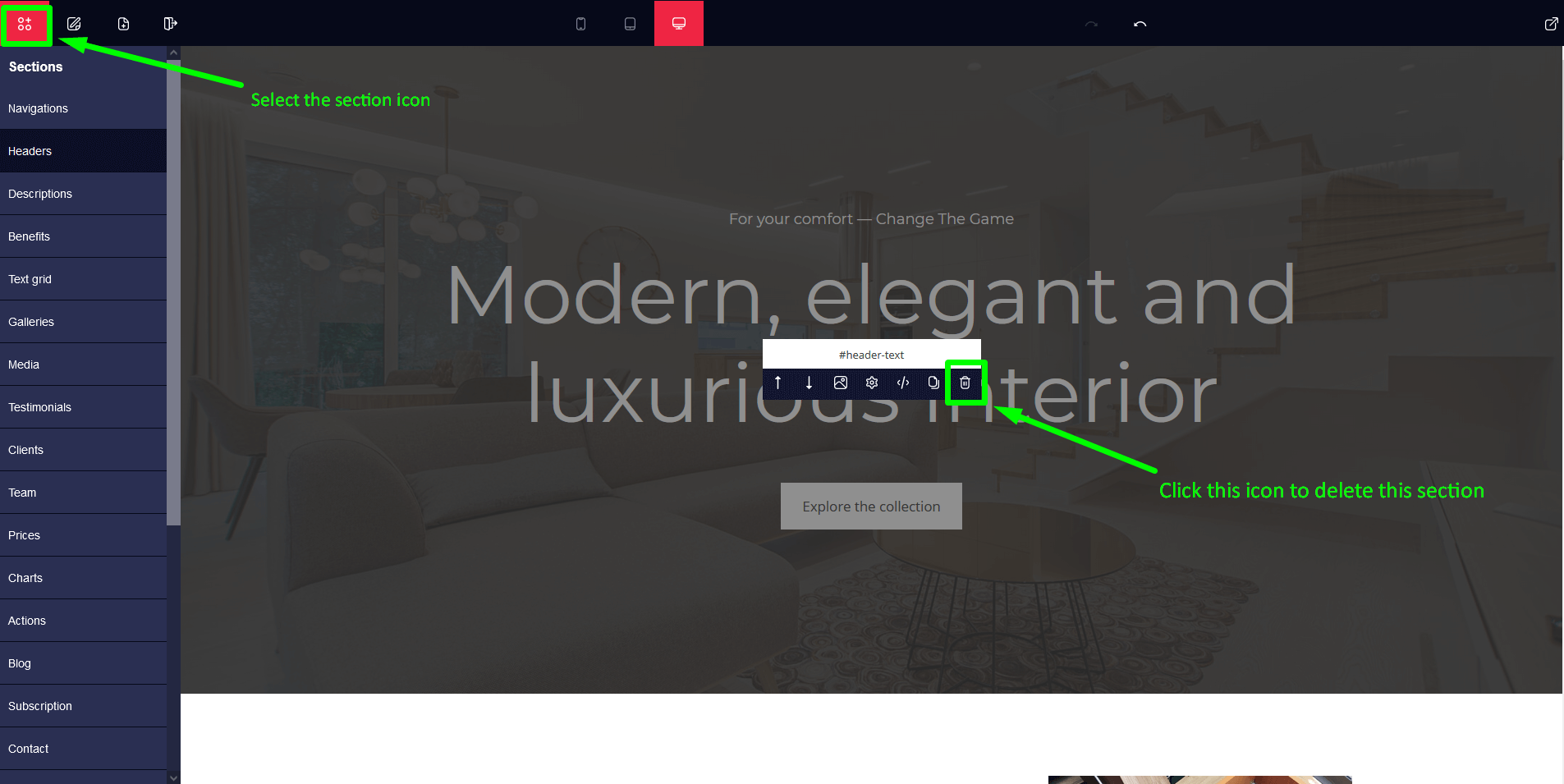 To delete a section, click section icon and then click delete icon on the panel. Steps age given in below picture.