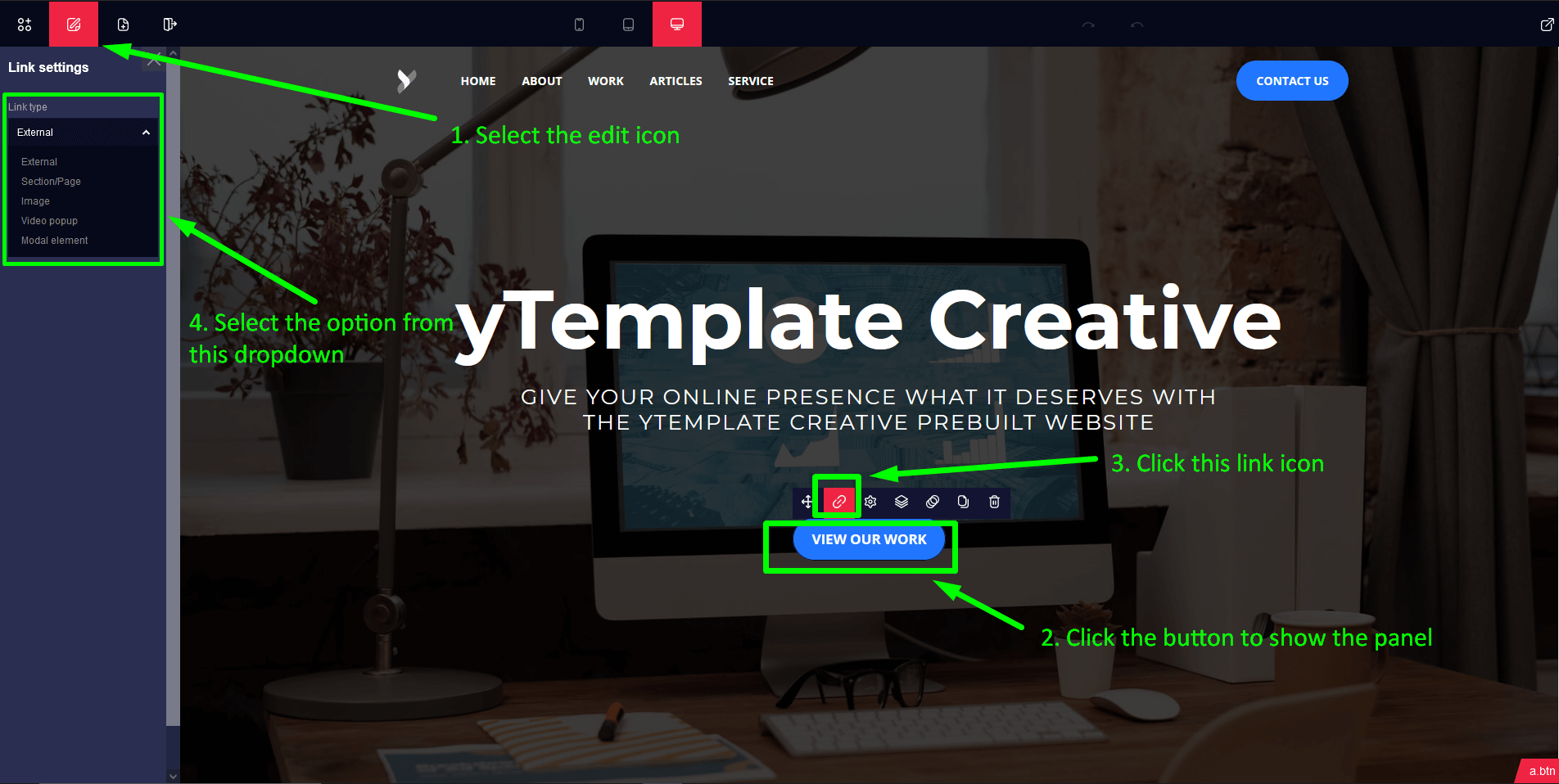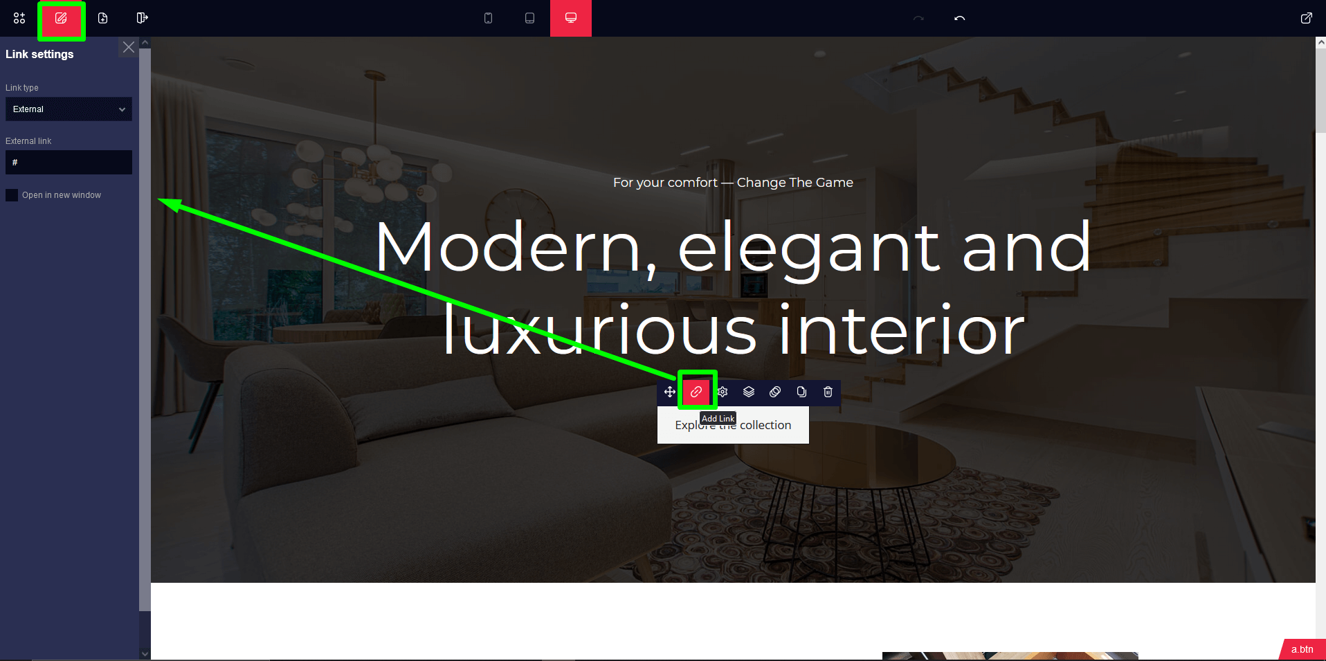 To make any content clickable with link, Single/Double click on the content and then we can show a panel, click on the link icon of the panel then a sidebar will be open at left side of the window. Now we can write or paste link in the external link box