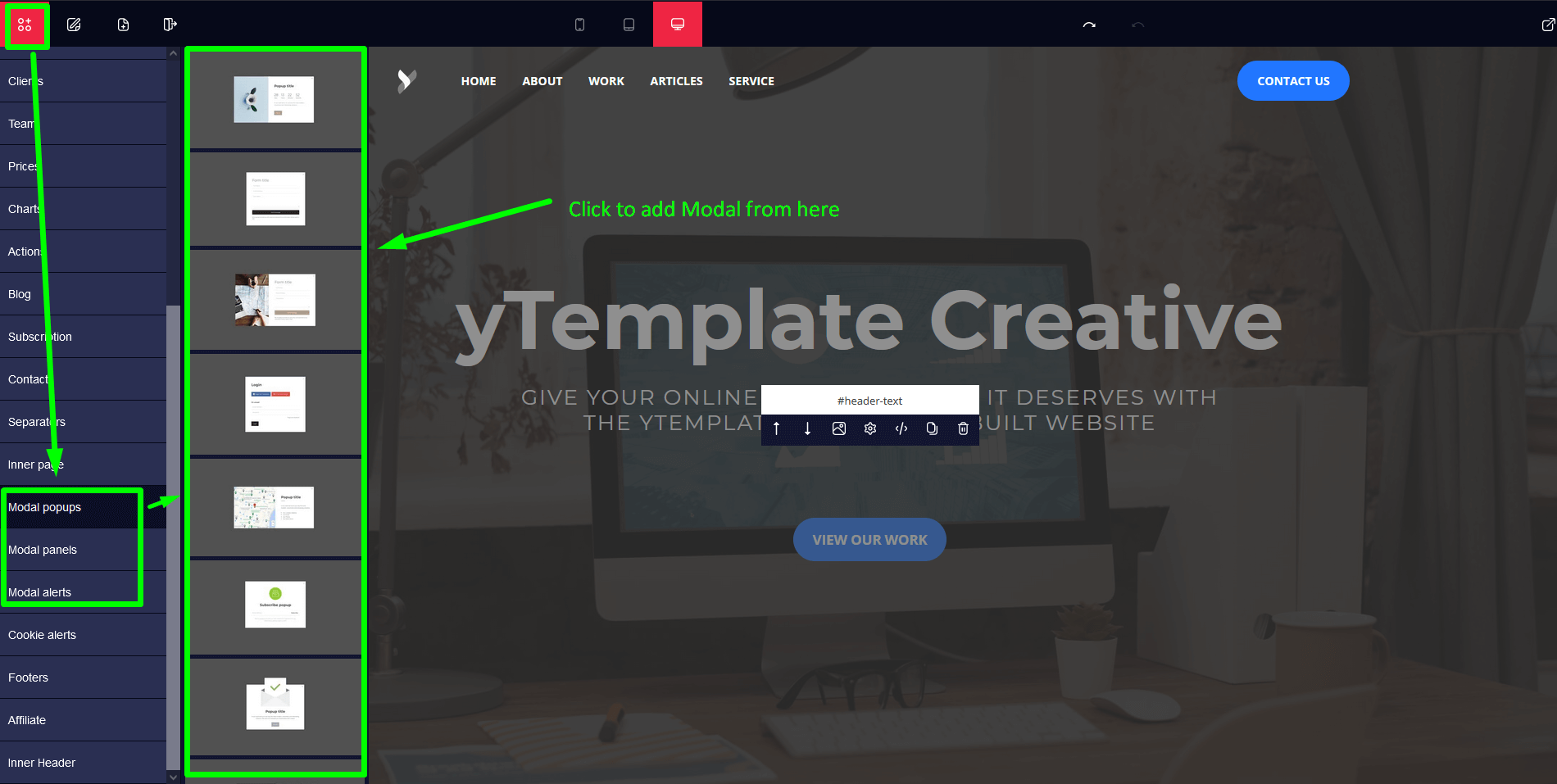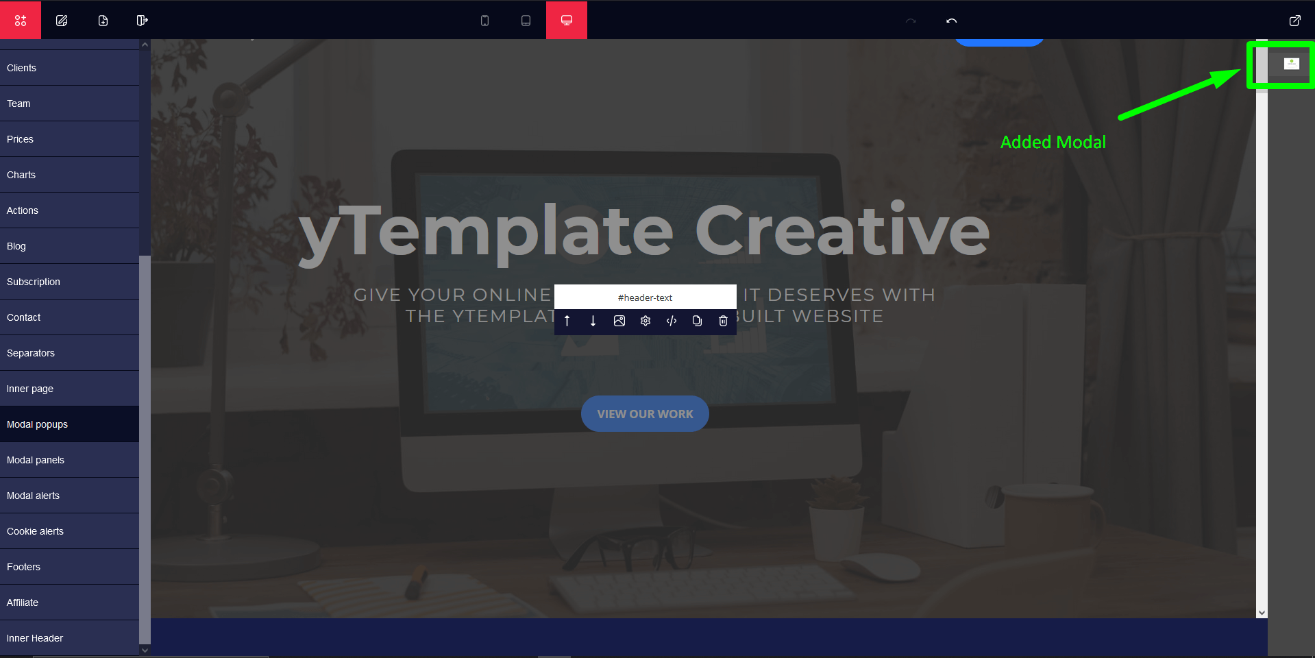At first we need to add modal form, sidebar, alert etc. from sections > modal popup, modal panel, modal alert > choose a section, now which will show at top right side of the window