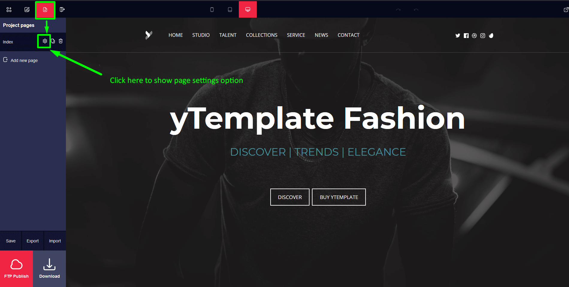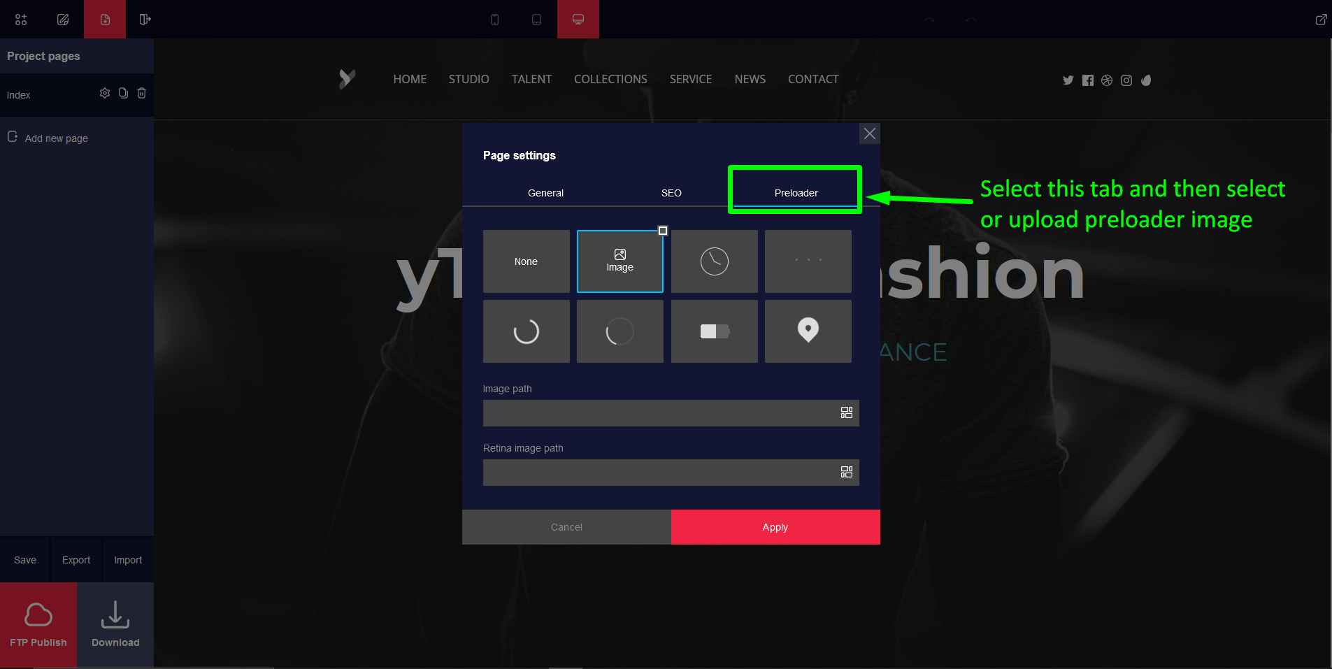 Click on the Porject Page icon and then its show the page list and then click setting icon of the page then a page setting modal will be show in the middle of the window, here we click preloader tab and then we can select any preloader or upload any image.
