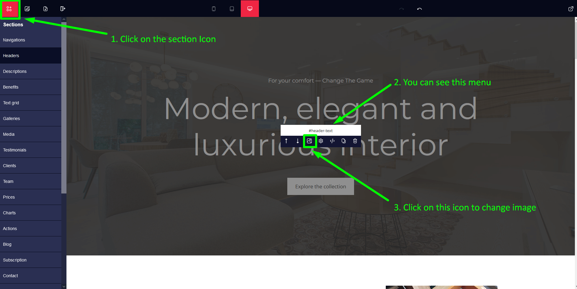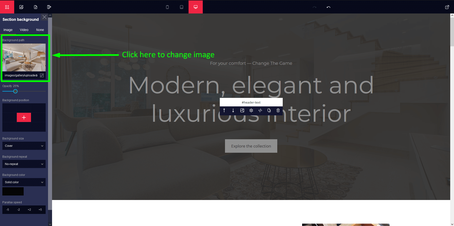 For changing any sections background image, at first we need to click on section icon from the left sidebar. Then we will see a panel on center of the window, Then click on the image icon and we will see a sidebar from left side, Here we can change the image.