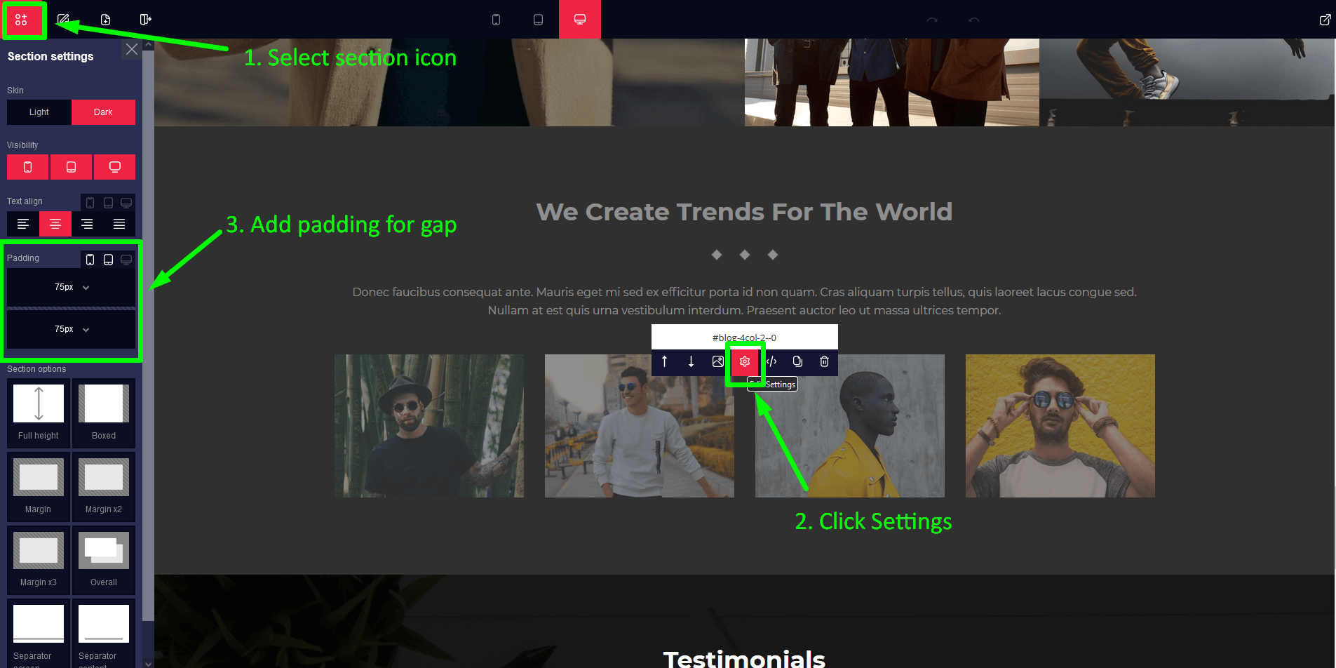 Click on the Section icon and then its show a panel middle of the window, here we click settings then a sidebar open on the left side and then change value of padding.