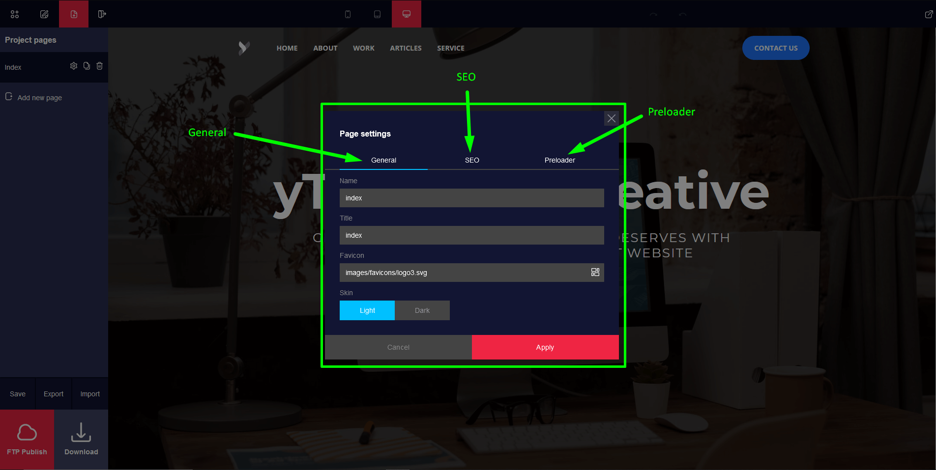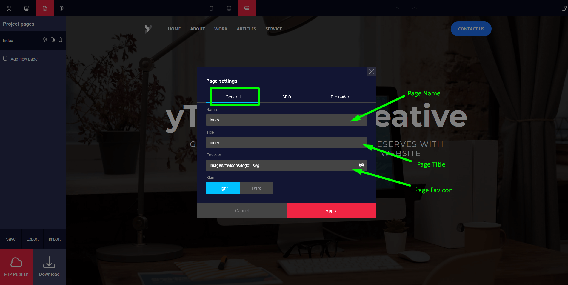 This popup menu has three tab, first one is General where we can add Page Name, Page Title, Favicon.
