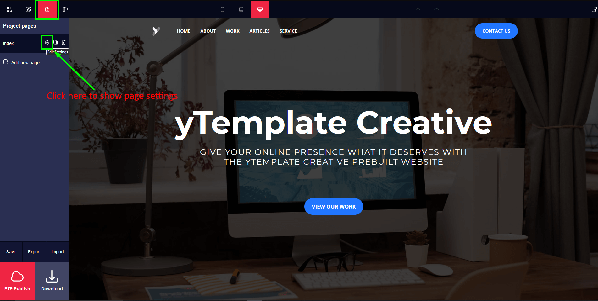 Click on the Project Page icon, open a sidebar menu, and here we see the page list with the settings icon then click this settings icon after that a popup show in the middle of the window